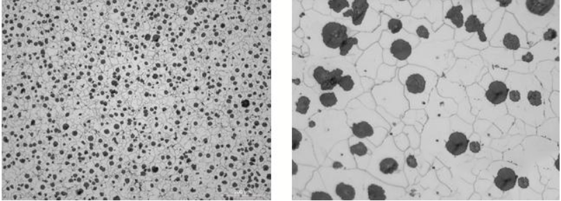 Према томе, на основу емпиријског посматрања, горња граница еквивалента угљеника у нодуларном гвожђу се достиже када се посматра плутајући графит у истопљеном гвожђу (на температури око 1200°Ц). Утицај садржаја угљеника на перформансе дуктилног гвожђа: Садржај угљеника у одливцима од нодуларног гвожђа утиче на количину преципитног графита у просеку који се односи на просечну величину чврстог графита. графитне сфере. Типично, садржај угљеника уодливци од нодуларног гвожђакреће се између 2% и 3,9%, али је кључно разумети утицај смањења садржаја угљеника на механичка својства ливеног гвожђа. Ово треба узети у обзир на основу структуре, димензија, дебљине зида и грешака у дебљини зида суседних равних зидова зида.одливци од нодуларног гвожђа. Смањење садржаја угљеника у нодуларном гвожђу са око 4% на 2,5% може незнатно повећати затезну чврстоћу и границу течења (око 23 до 31 Н/мм²) и такође повећати издужење за око 5%, уз значајна побољшања вредности ударца.